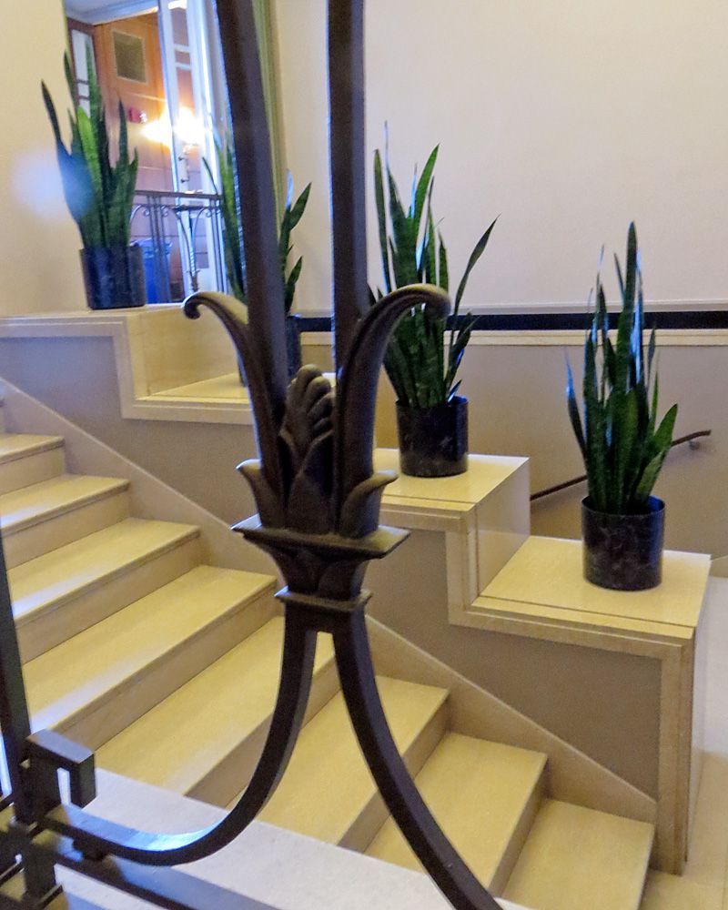 The Art Deco style is seen throughout the building in the gorgeous ceiling decorations and bronze stairwell railings.