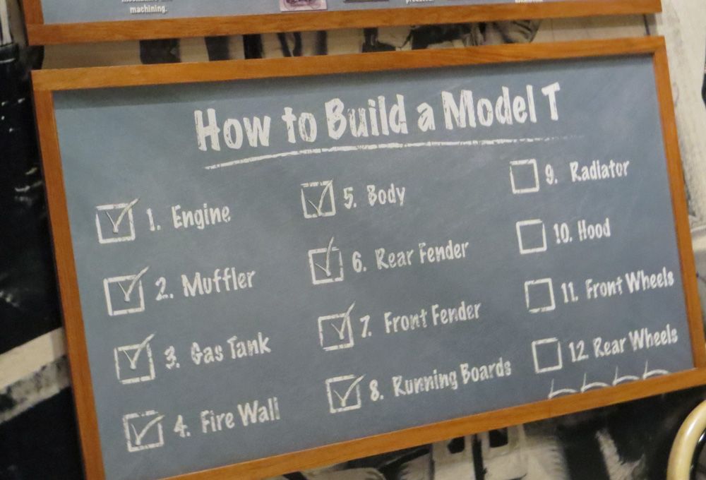 With three museum staff explaining what to do, I followed the checklist on the chalkboard (along with several other museum visitors) and helped assemble an authentic Model T from scratch. It was easy to install the gas tank, front tires, and hood for the car.